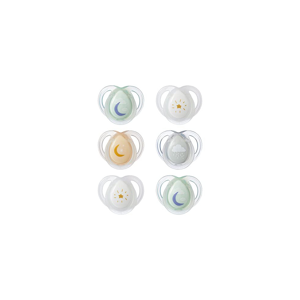 Tommee Tippee Nighttime Soothers, 0-6m, 6 Pack, Glow in The Dark, Varied Colours and Designs, Symmetrical Orthodontic Dummy, BPA-Free Silicone Teat