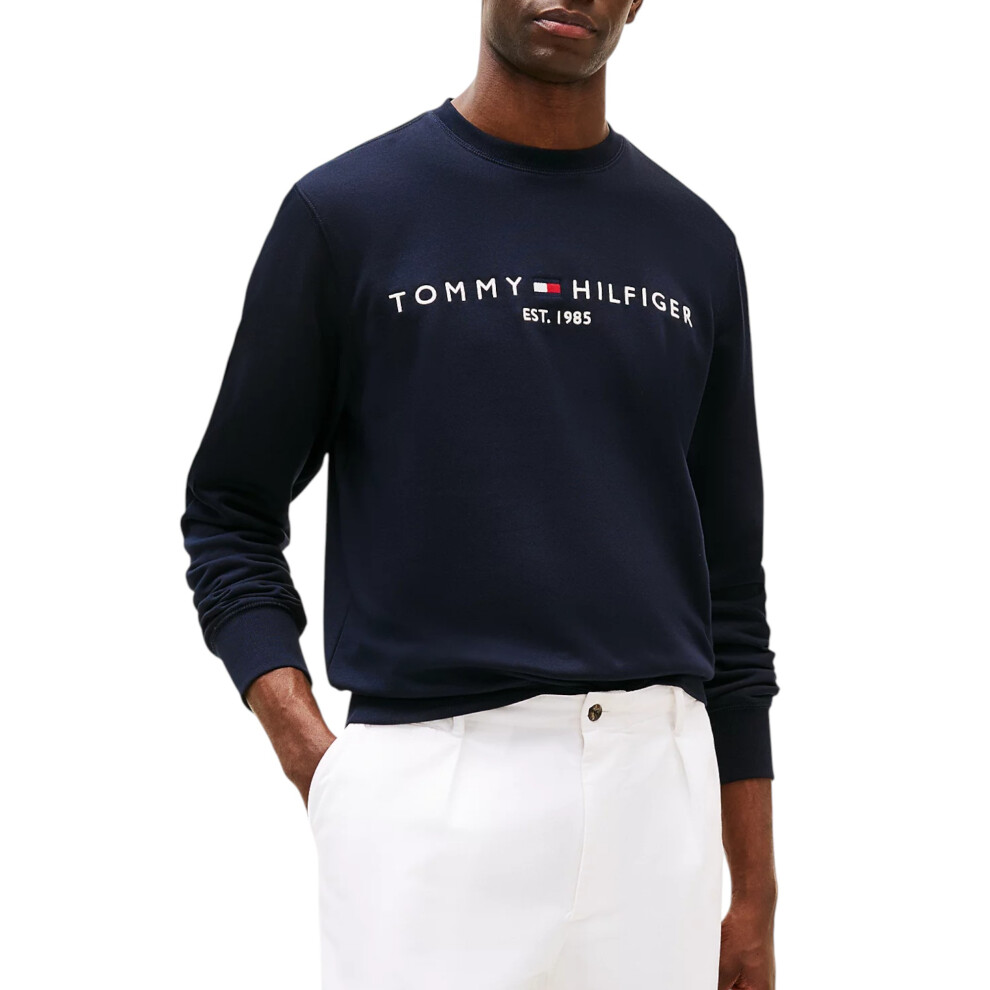 (Navy Blue, S) Tommy Hilfiger Mens Fleece Sweatshirt Embroidered Logo Pullover Crew Neck Jumper