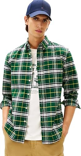 Tommy Hilfiger Men’s Flex Poplin Mini Tartan Regular Fit Shirt, Green (Ornamental Green/Check), M