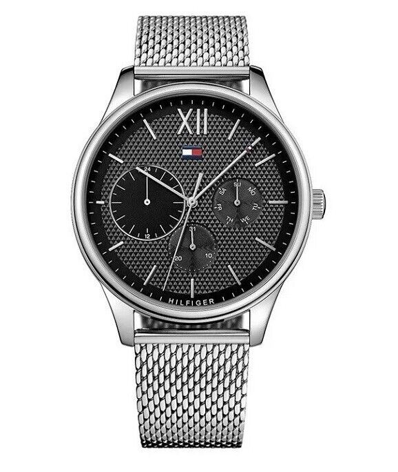 TOMMY HILFIGER MENS WATCH MESH BAND STRAP SILVER & BLACK DIAL TH1791415 GENUINE