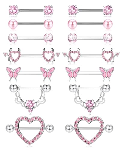 DAVBNM 7 Pairs Nipple Piercing Jewellery, 14G Nipple Bars, Bar Piercing Tongue Bar Nipple Bar, Surgical Steel Nipple Jewellery Body Piercing for Women(Pink)