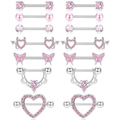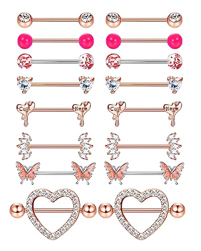 ADRAMATA 8 Pairs 14G Nipple Bars Surgical Steel Nipple Piercing Set CZ Butterfly Nipple Rings Barbell Rings Ball Heart Nipple Bar Tongue Bar Nipple Piercing Jewellery Body Piercing for Women