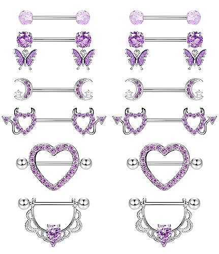 CASSIECA 6 Pairs 14G Nipple Bars Nipple Bar Purple Nipple Piercing Jewellery Surgical Steel Nipple Piercing Kit Tongue Bar Set Cute Butterfly Dangly Barbells Heart Flower Moon Body Piercing Barbell