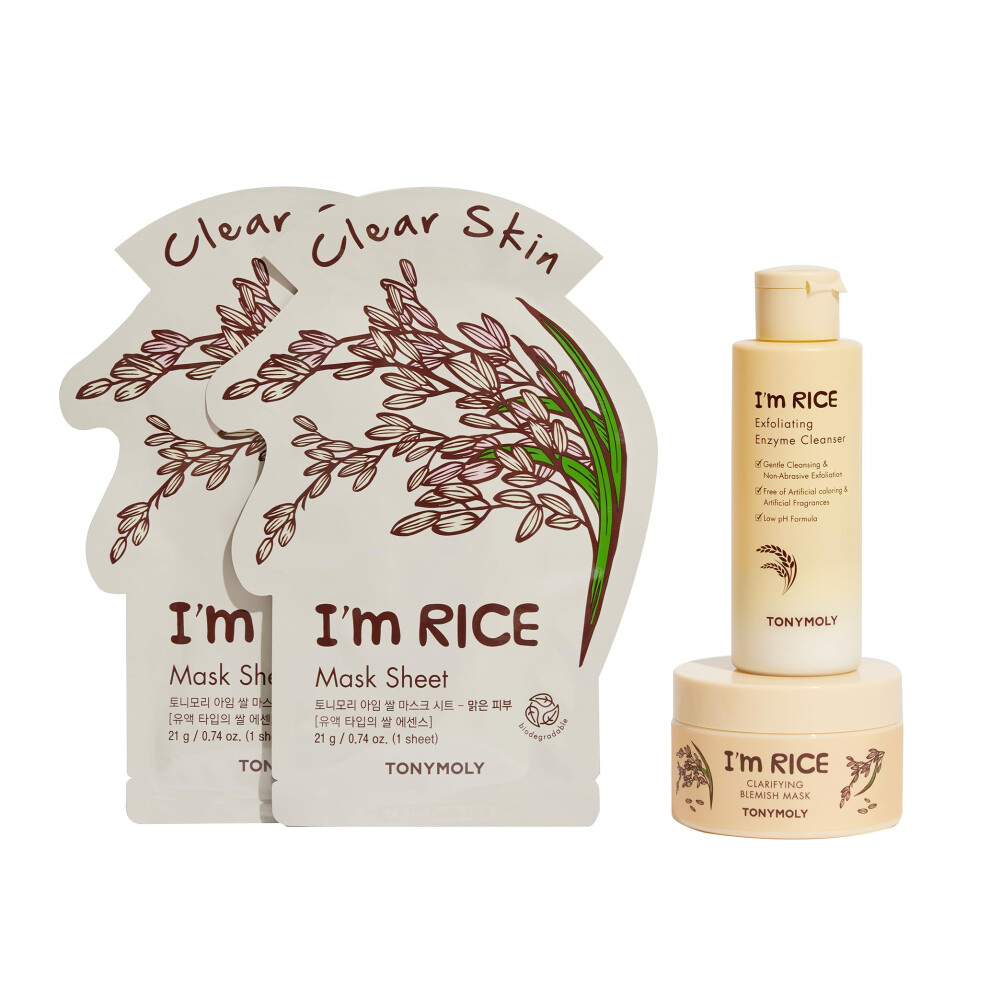 TONYMOLY I'm Rice Clarifying Skincare Set - 3-Step Face Care for Clear Hydrated Skin - Includes Enzyme Powder Cleanser Blemish Mask & Nourishin