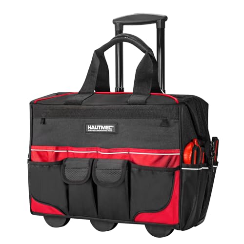 HAUTMEC 18" Rolling Tool Bag on Wheels, Heavy-Duty Tool Bag with High-Density Oxford Fabric, Oversized Off-Road Wheels, Wide-Mouth Design, 23-Pocket, Double Zipper & Telescoping Handle - HT0059
