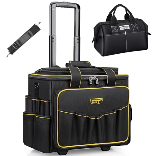 WINHUNT Rolling Tool Bag with Wheels, 22 Inch Heavy Duty Adjustable Telescopic Handle Tool Trolley with a small tool bag, Wide Mouth Storage Organiser For Construction, Electrician, Mechanic