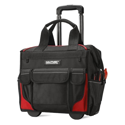 HAUTMEC 14.5" Rolling Tool Bag on Wheels, Heavy-Duty Tool Bag with High-Density Oxford Fabric, Oversized Off-Road Wheels, Wide-Mouth Design, 25-Pocket, Double Zipper & Telescoping Handle - HT0179