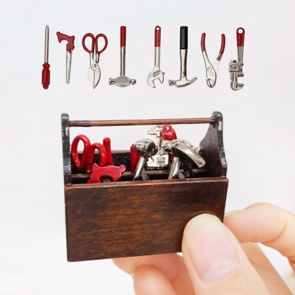 Haofy Doll House Toolbox, Wooden Toolbox with 8 Metal Tools Set for 1/12 Scale Dollhouse Accessories