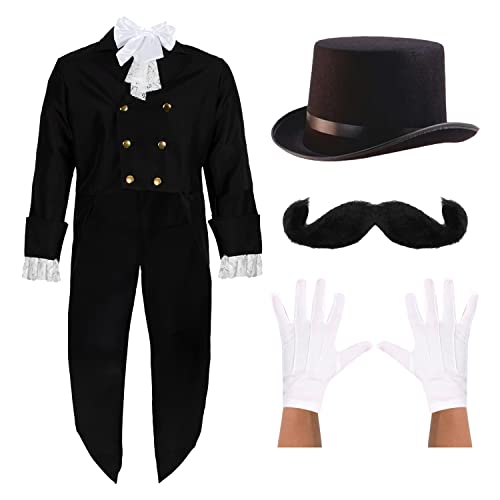 Posh Victorian Man Costume - Medium - Black Victorian Jacket, White Cravat, Satin Bell Top Hat, White Gloves and Moustache - Historical Fancy Dress Costume