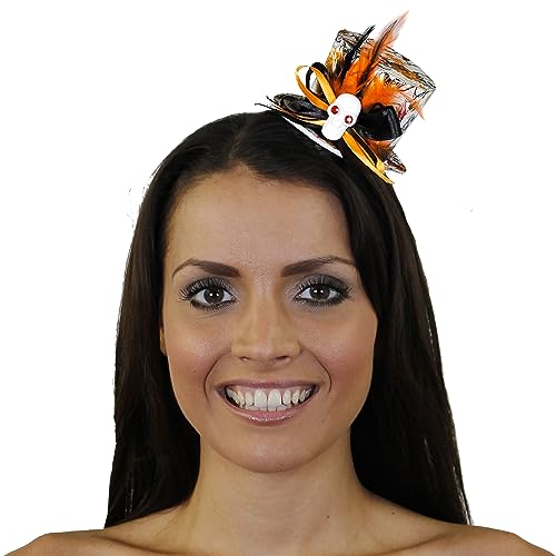 Mini Skull Top Hat Accessory - Pack of 1 - White Skull and Orange Rose Print Top Hat with Orange and Black Feather Detail - Adults Halloween Day of the Dead Fancy Dress Costume Accessory