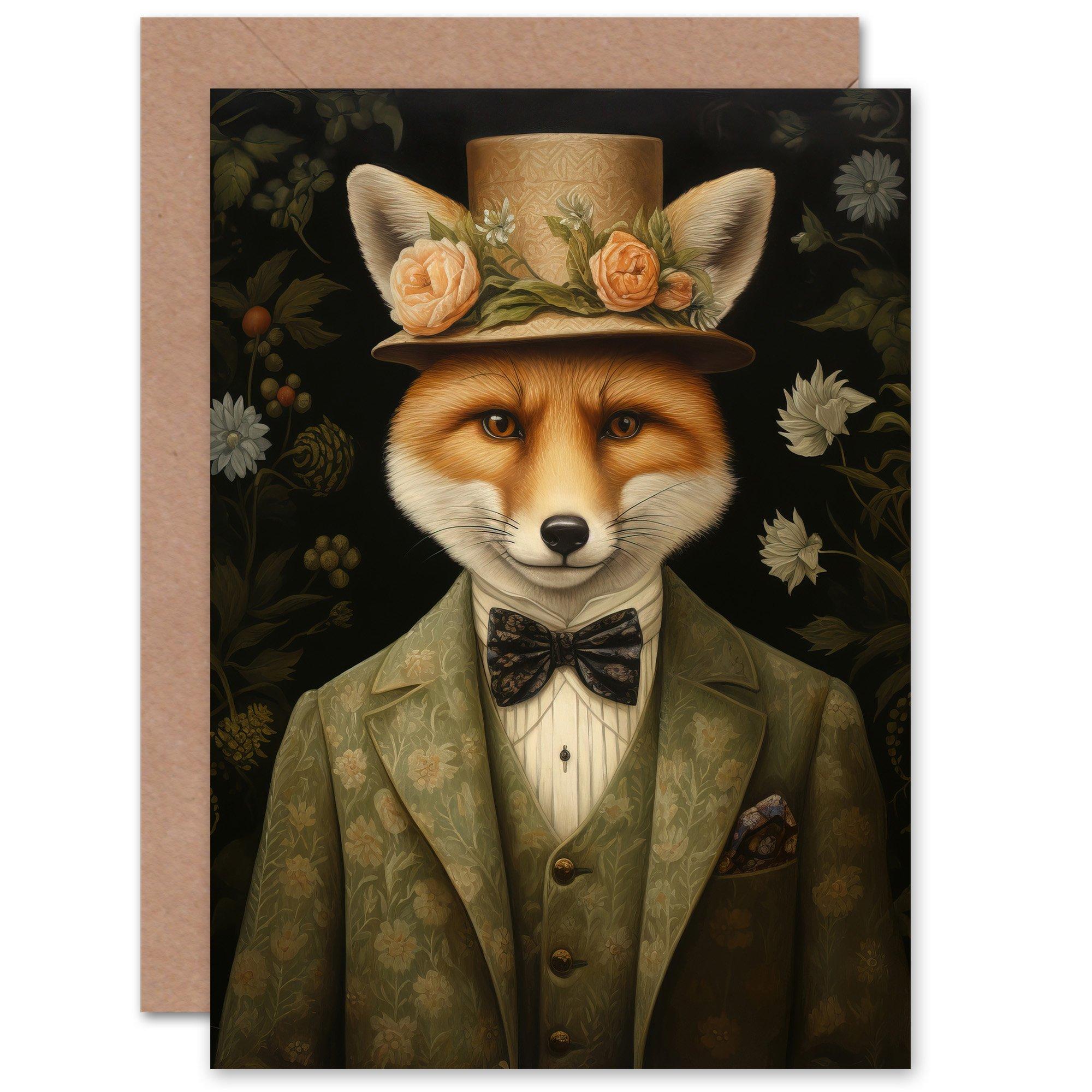 Fox Floral Victorian Top Hat and Tails for Him Her Birthday Blank Greeting Card