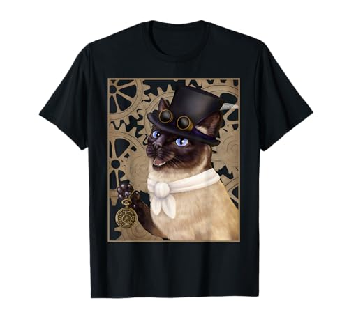 Steampunk cat - Siamese with a top hat, goggles, and gears T-Shirt