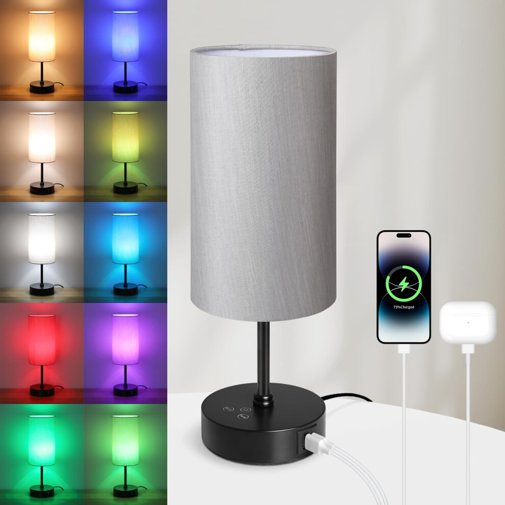 Befurglor Bedside Table Lamps, Stepless Dimmable 3 CCT and RGB 7 Colors, Table Lamp with USB A+C Charging Ports, Touch Lamps for Bedroom Living Room(Grey Fabric Shade)