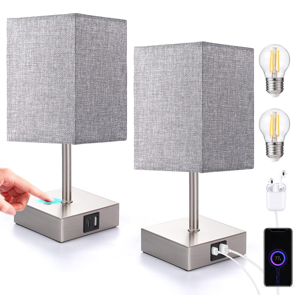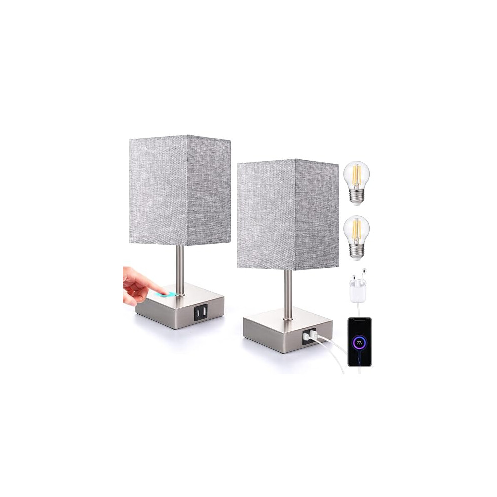 Caza Bedside Lamps, Touch Lamps Bedside With 2 USB Charging Ports, A Bedside Lamp With USB & USB C, Dimmable Bedside Table Lamp With Fabric Shade For Bedroom, Living Room, LED Bulb Included (Grey)