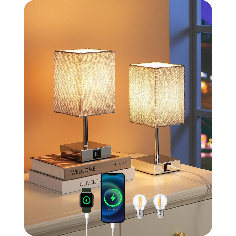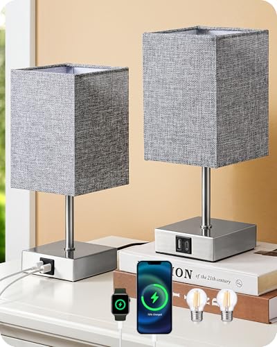 EDISHINE Bedside Lamps Set of 2, 3 Way Dimmable Table Lamps with USB A+C Charging Ports, LED Bulb Included, Touch Lamps for Bedroom, Living Room, GrayLinen Lampshade, 2700K