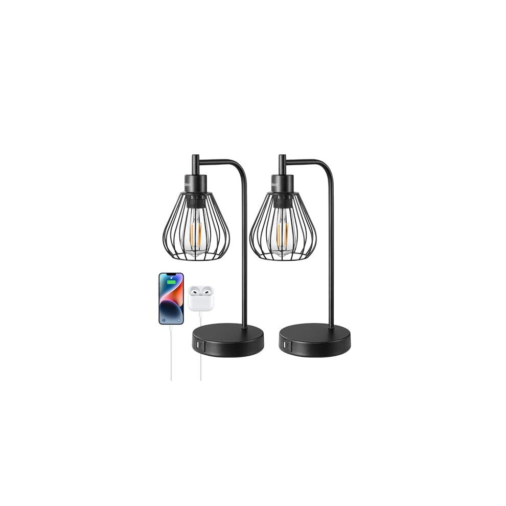 EDISHINE Bedside Lamps Set of 2, Dimmable LED Table Lamp, Teardrop Cage Lampshade, USB Charging Ports, Touch Lamps for Living Room, Bedroom, E27