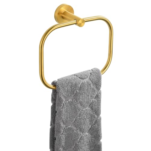 Brushed Gold Hand Towel Ring Square, Modern Towel Holder Gold for Bathroom Towel Hanger Wall Mounted, Stainless Steel