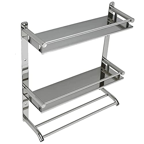 BBL Bathroom Shelf, Stainless Steel Bathroom Shelf Wall Mounted Shower Storage Organizer with Towel Rack, Hooks for Bathroom Kitchen Storage (Double Tier), Silver