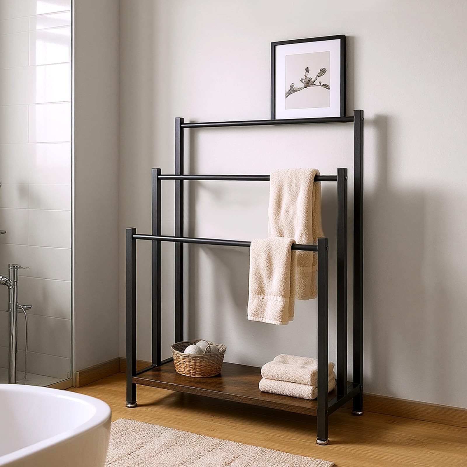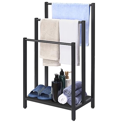 HOJINLINERO 3 Tier Freestanding Towel Rail Rack Stand,Metal Holder and Drying Bathroom Kitchen,Towel Ladder Towelsor Clothing,Bath Storage & Hand Towels,Washcloths, Black