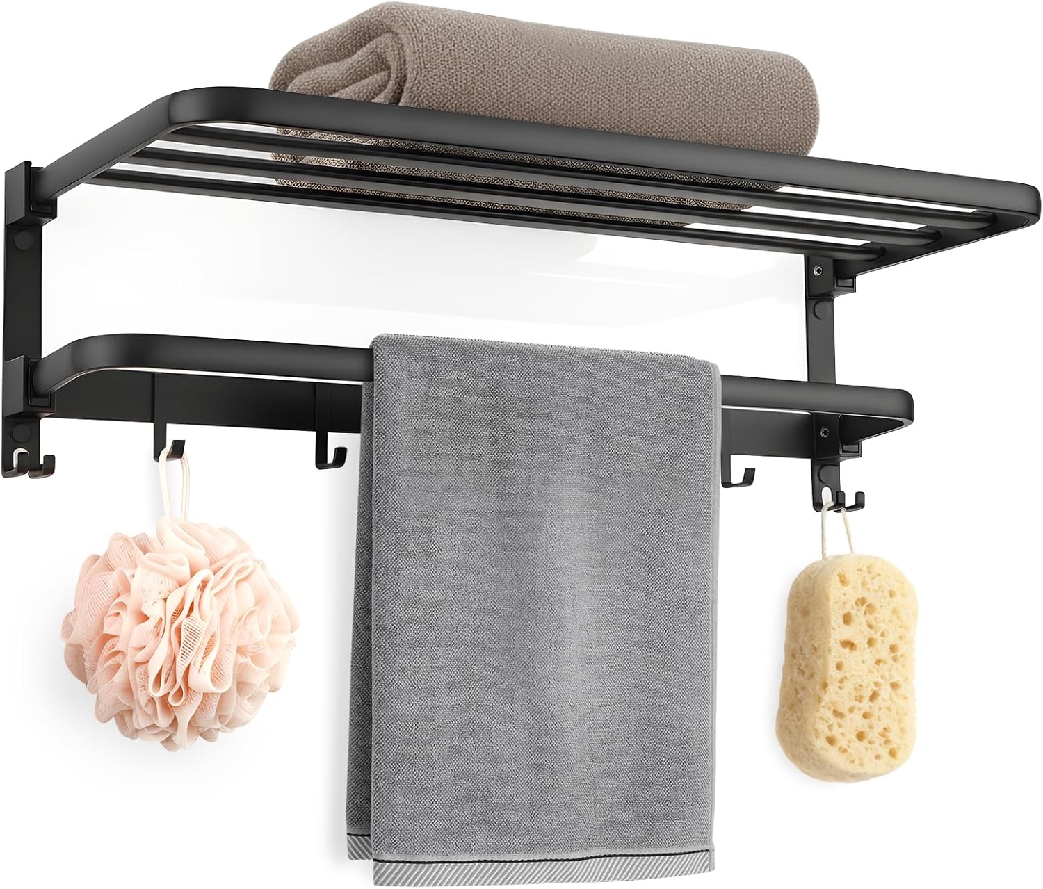JuanNest Wall Mounted Bathroom Towel Rack, Foldable Wooden & Aluminum Towel Rail with Shelf Towel Bars & Hooks for Space-Saving Nization,Bathroom Storage, Double-Layer Storage Rack Home,Hotel 60cm