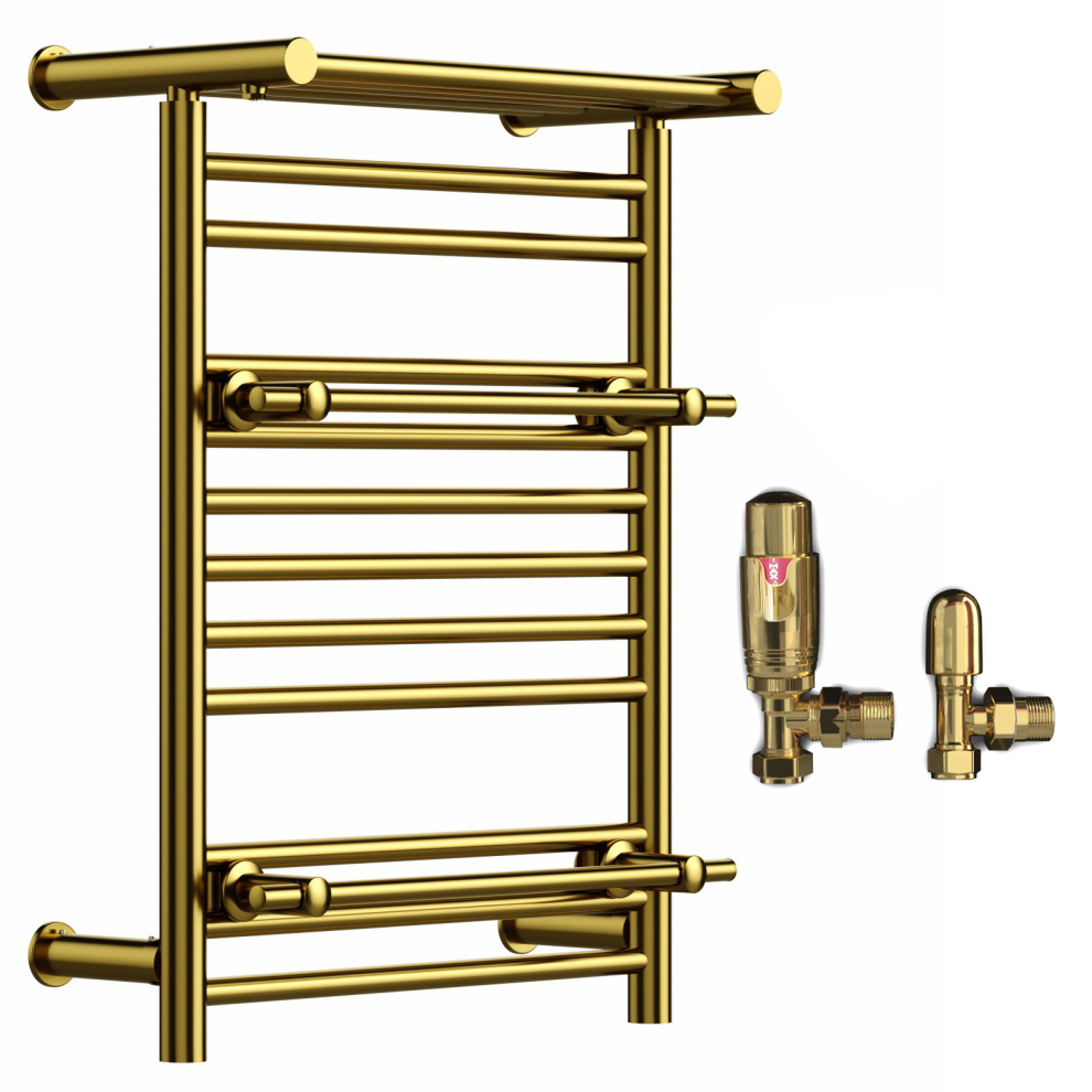 (Shiny Gold, With TRV Straight Valves) Designer Heated Towel Rail Radiator With Top Shelf OSLO