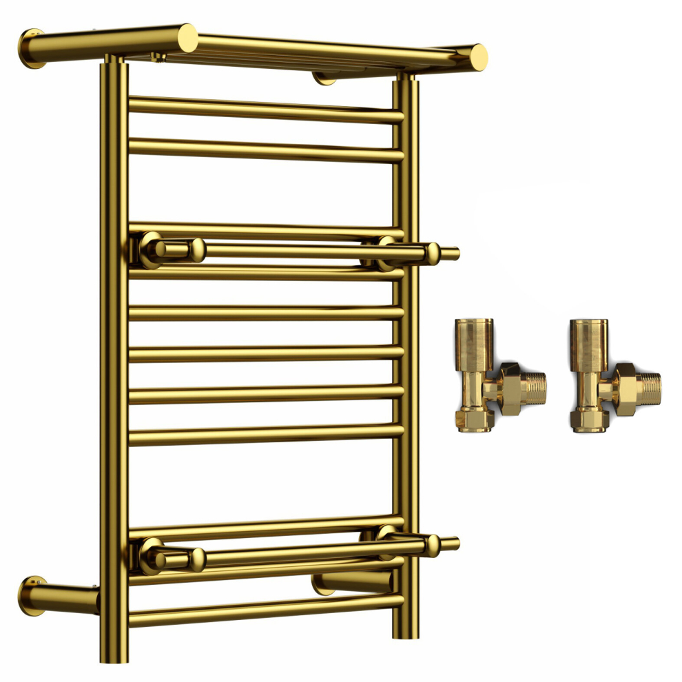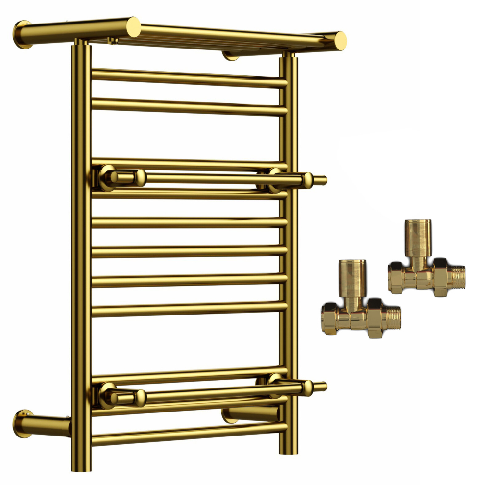 (Shiny Gold, With Straight Valves) Designer Heated Towel Rail Radiator With Top Shelf OSLO
