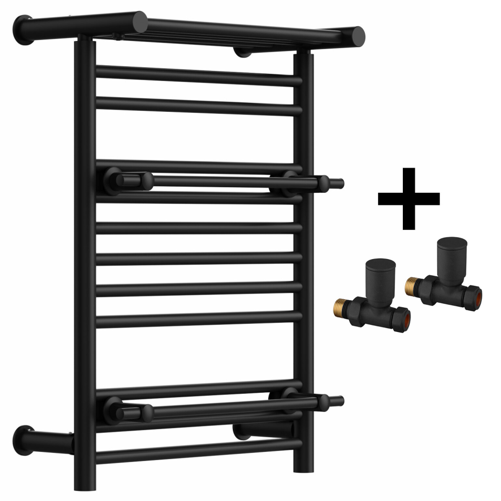 (Matt Black, With Straight Valves) Designer Heated Towel Rail Radiator With Top Shelf OSLO