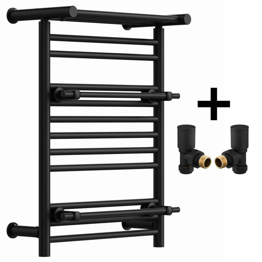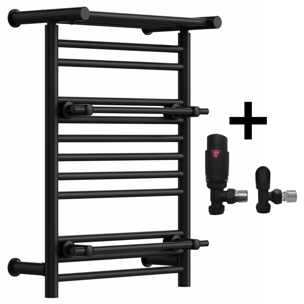 (Matt Black, With TRV Angled Valves) Designer Heated Towel Rail Radiator With Top Shelf OSLO