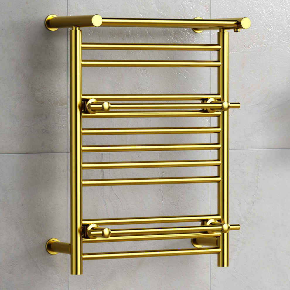 (Shiny Gold, No Valves) Designer Heated Towel Rail Radiator With Top Shelf OSLO