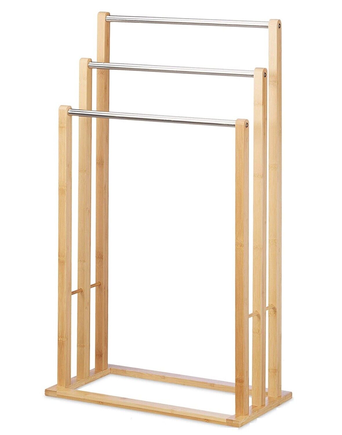 Bamboo wooden towel holder freestanding with 3 towel rails stainless steel poles