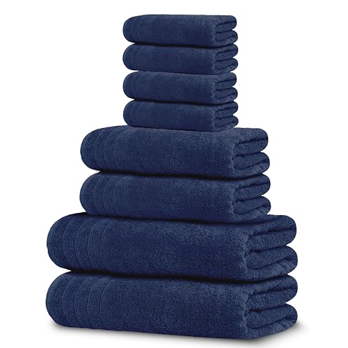 Tens Towels Pack of 8 Towels Set, 2 Extra Large Bath, 2 Hand, 4 Washcloths, 100% Cotton, Lighter Weight, Quicker to Dry, Super Absorbent, Perfect for Bathroom, Navy