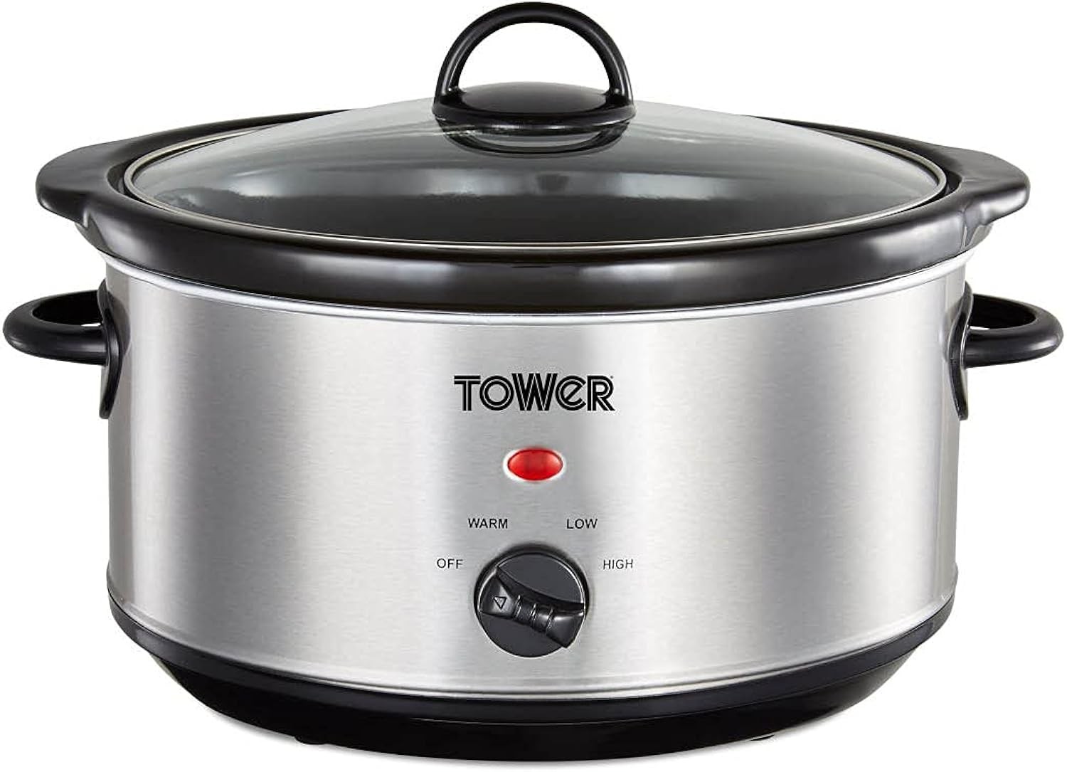 Tower T16039Y Slow Cooker with 3 Heat Settings and Removable Dishwasher Safe Pot, 3.5 Litre, Stainless Steel