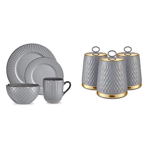 Tower T867002GRY Empire 16 Piece Dinnerware Set, Stoneware, Grey and Brass & T826091GRY Empire Set of 3 Storage Canisters for Tea Coffee Sugar, Grey and Brass, 1.3L, One Size