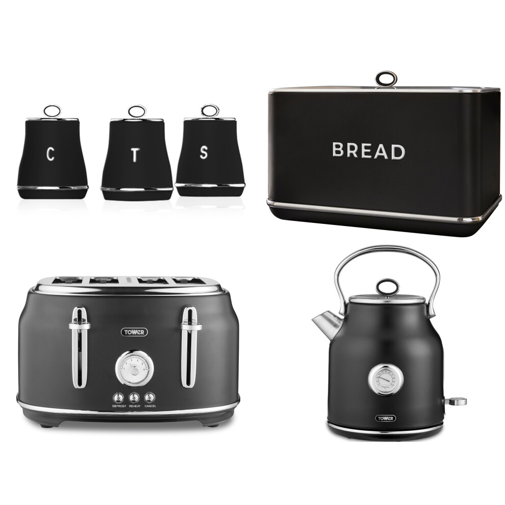 Tower Sera Black Kettle 4 Slice Toaster Breadbin Canisters Matching Kitchen Set