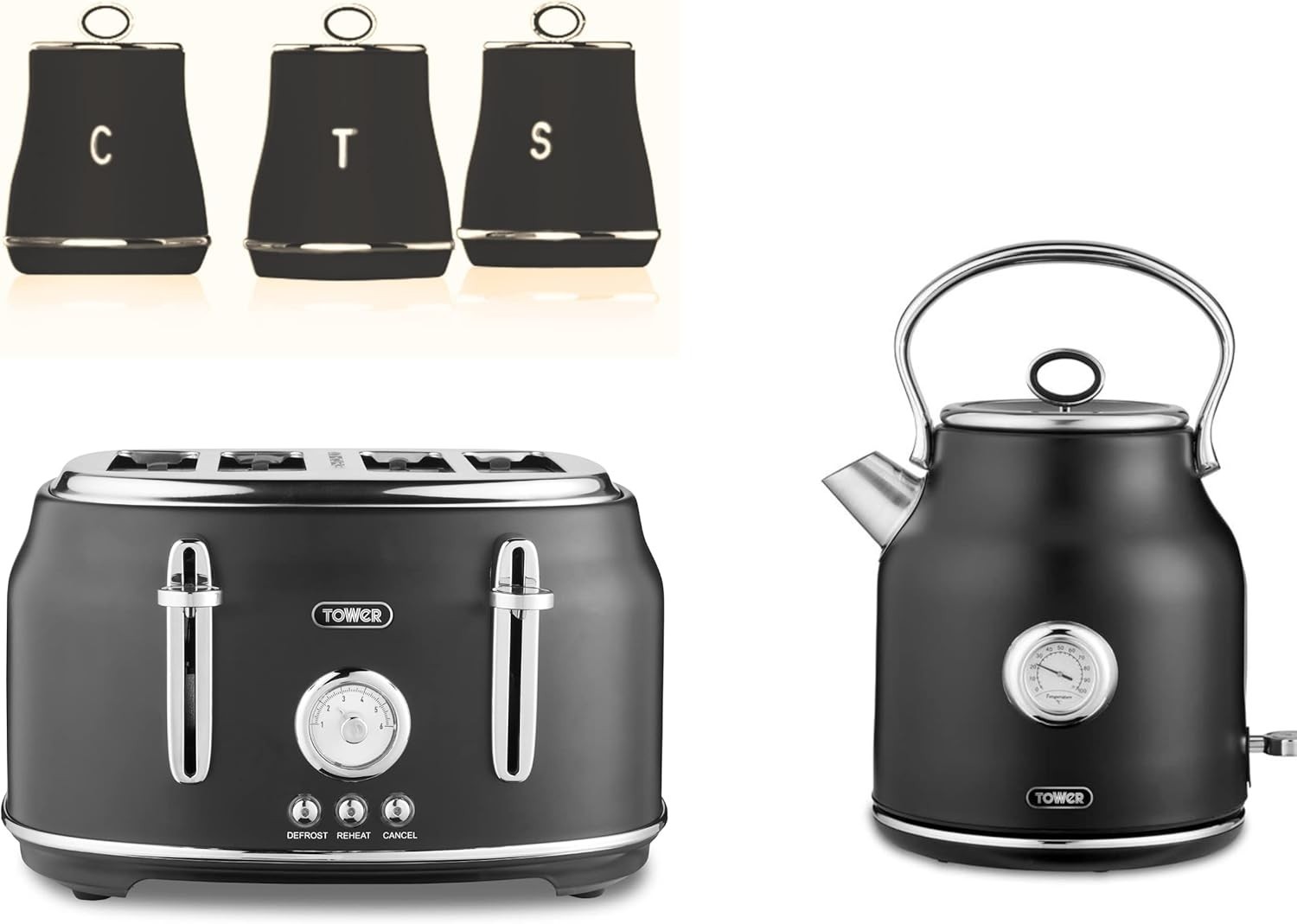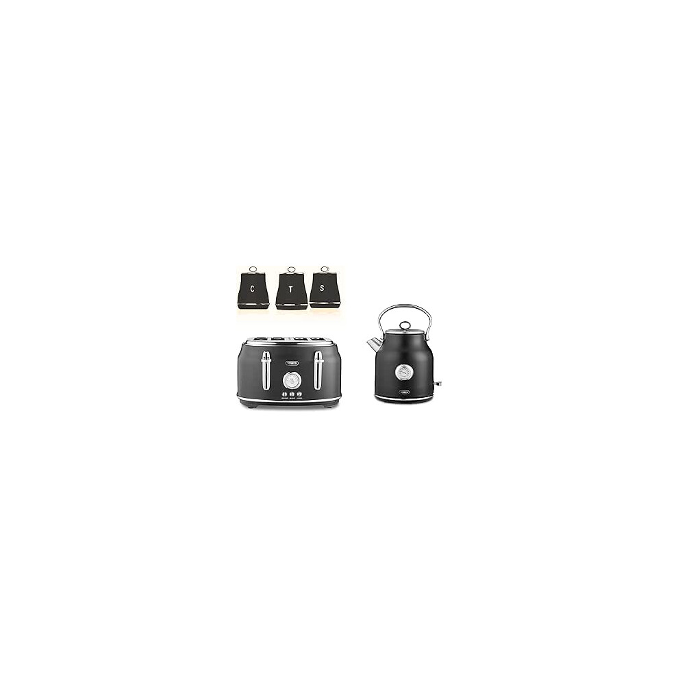 Tower Renaissance Black Kettle 4 Slice Toaster & Canisters Matching Kitchen Set