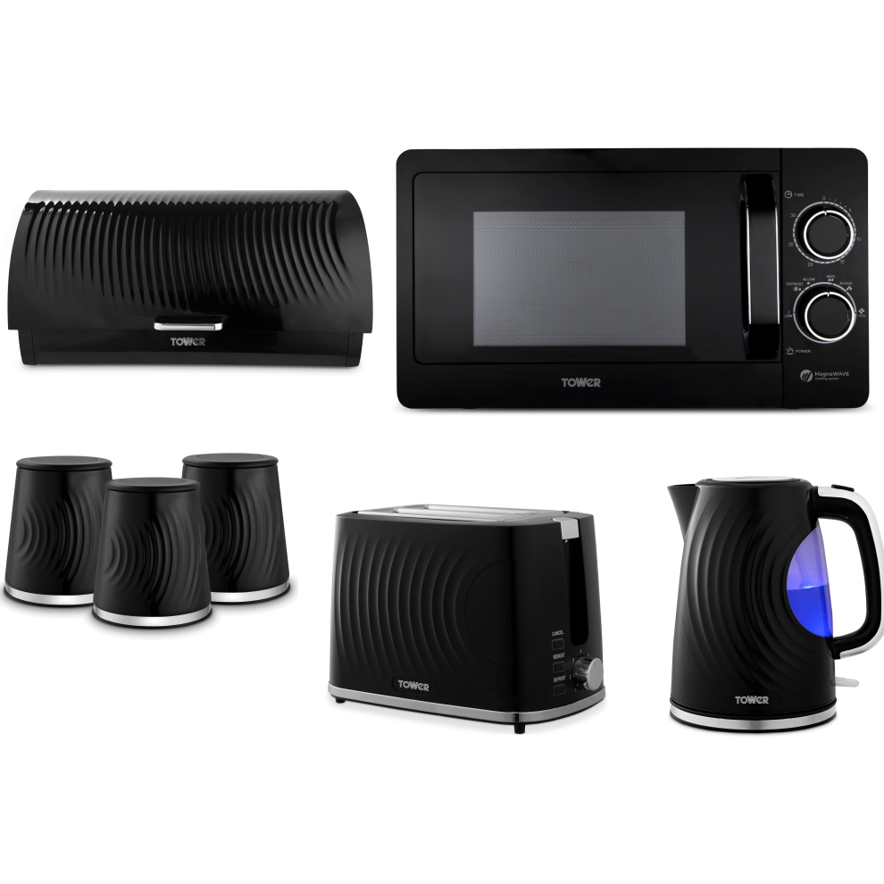Tower Cavaletto Black Jug Kettle Toaster Microwave Breadbin Canisters Set