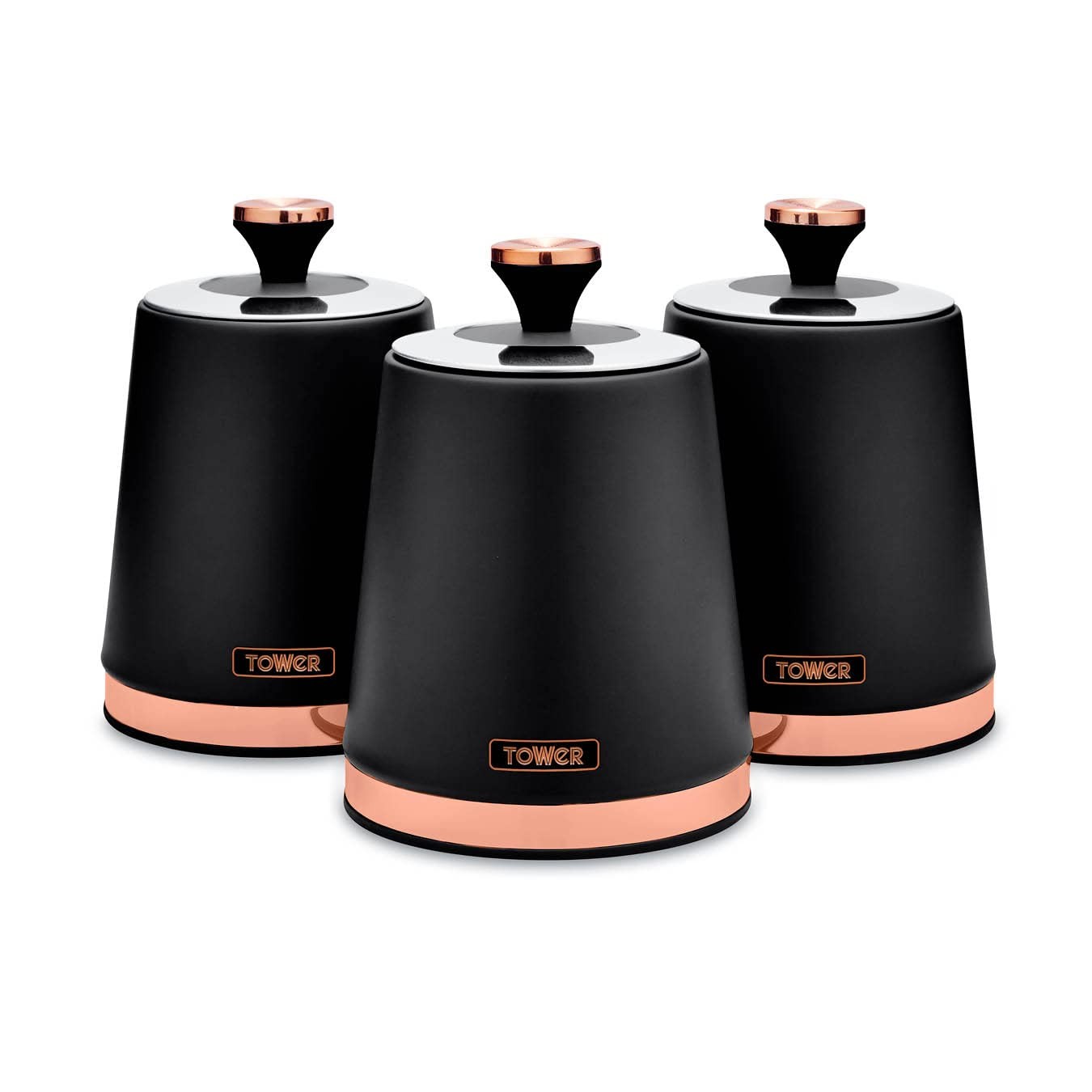 Tower Linear Set of 3 Storage Canisters, Stainless Steel, Black and Rose Gold ,