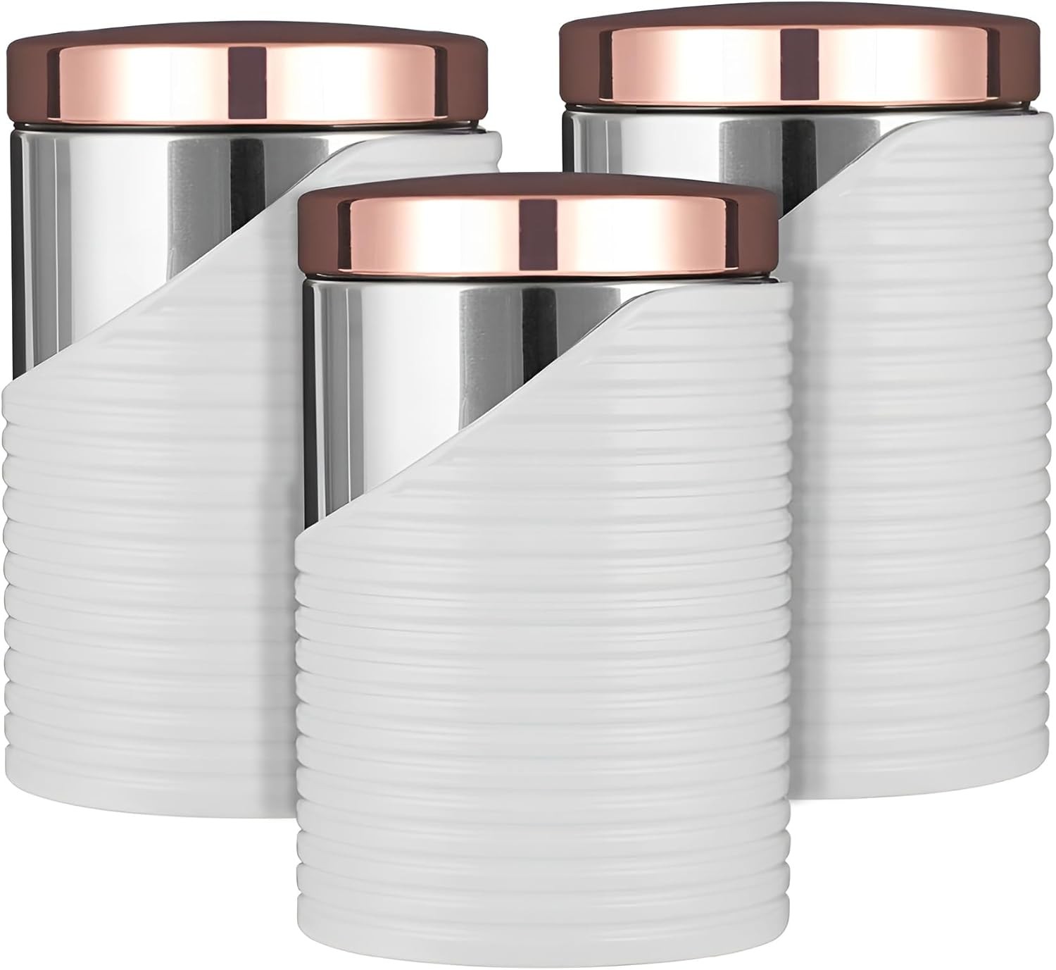 Tower Linear Set of 3 Canisters with Air Tight Lid and Polished Stainless Steel, White and Rose Gold, 11.6 x 11.6 x 17cm