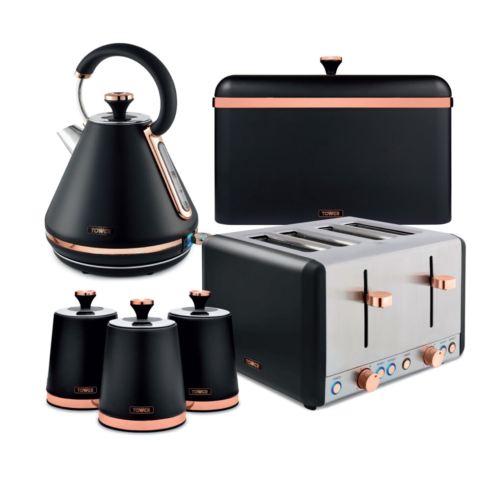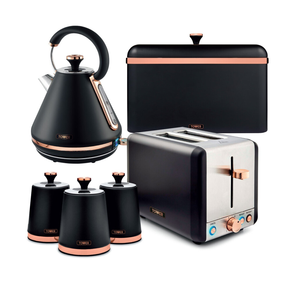 Tower Cavaletto Kitchen Set 4 Piece Bundle â 3kW 1.7L Pyramid Kettle & 2 Slice Toaster with Bread Bin & Canisters â Black & Rose Gold â EEJB472