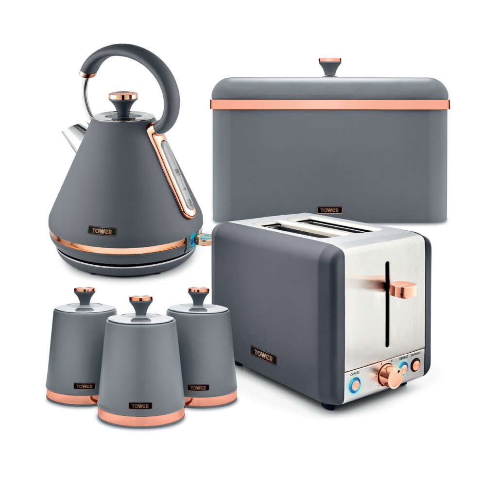 Tower Cavaletto Kitchen Set 4 Piece Bundle â 3kW 1.7L Pyramid Kettle & 2 Slice Toaster with Bread Bin & Canisters â Grey & Rose Gold â EEJB471