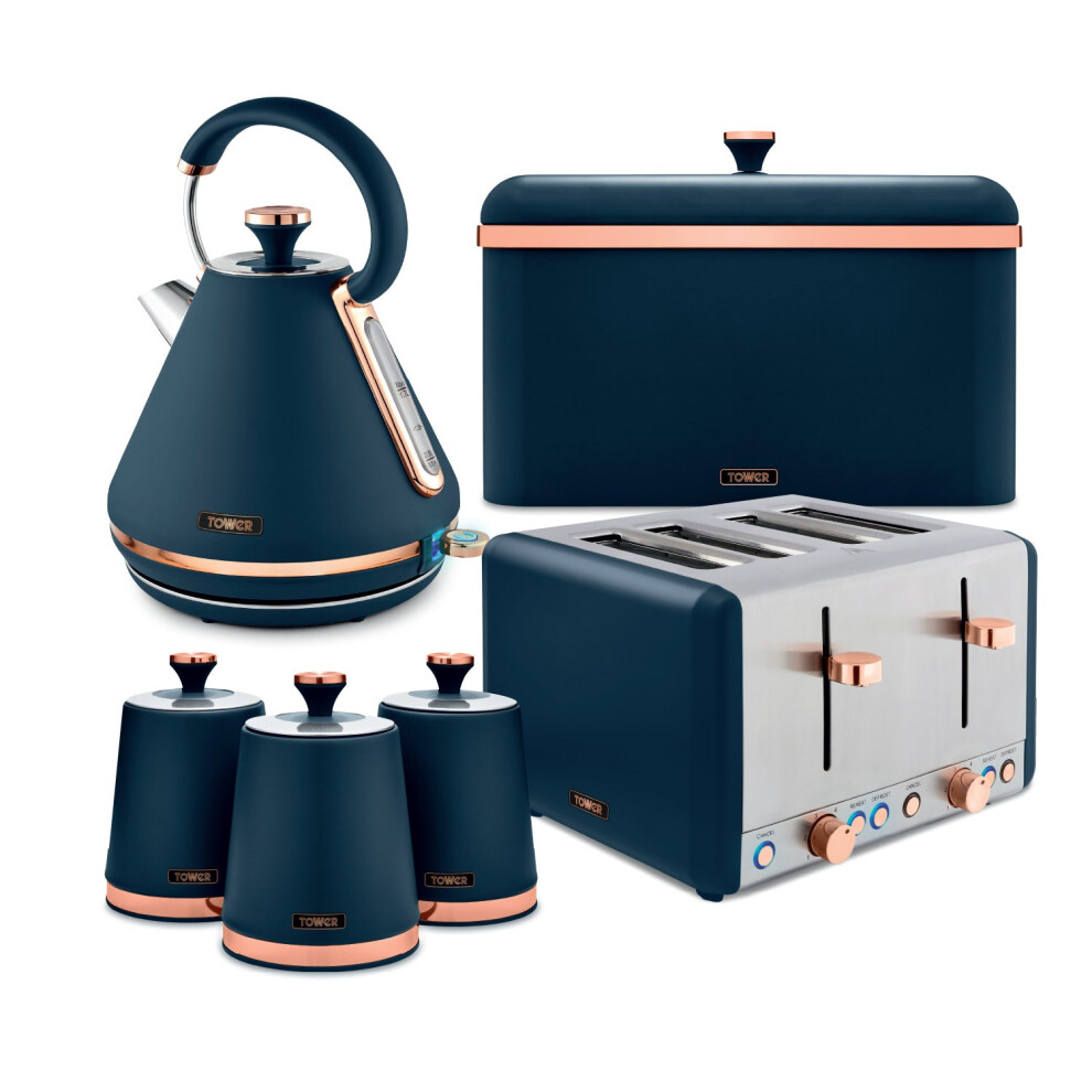 Tower Cavaletto Kitchen Set 4 Piece Bundle â 3kW 1.7L Pyramid Kettle & 4 Slice Toaster with Bread Bin & Canisters â Midnight Blue â EEJB473
