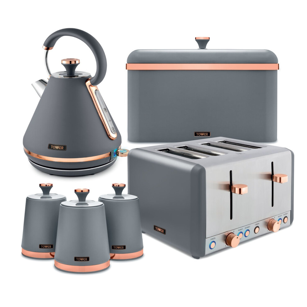 Tower Cavaletto Kitchen Set 4 Piece Bundle â 3kW 1.7L Pyramid Kettle & 4 Slice Toaster with Bread Bin & Canisters â Grey â EEJB474