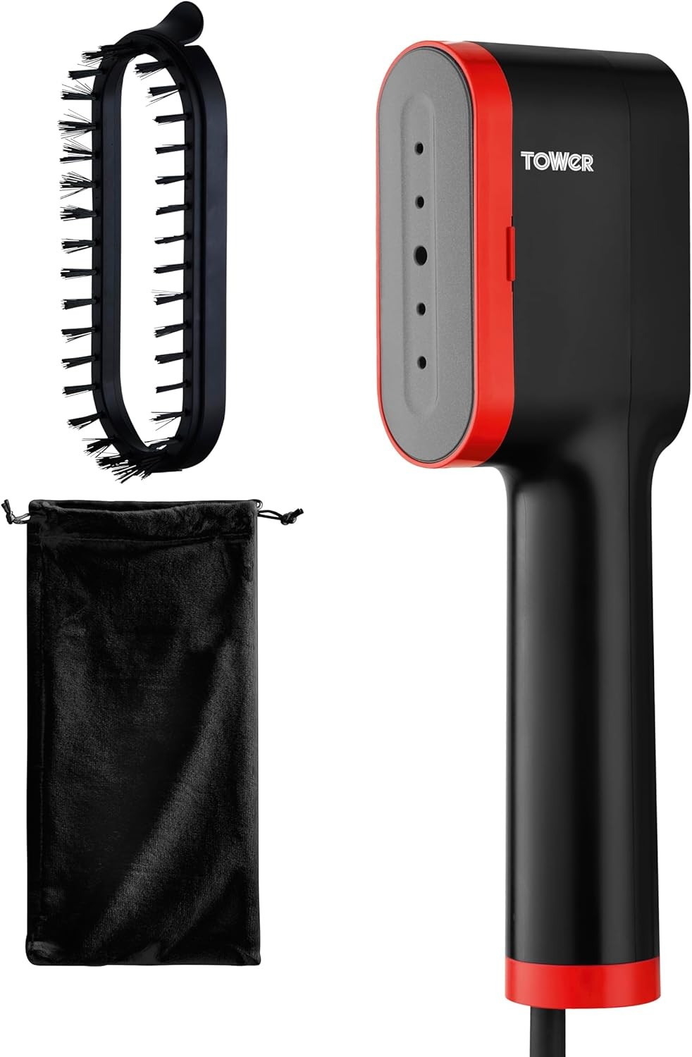 Tower T22038RED Ceraglide Handheld Garment Steamer with Ceramic Soleplate, Brush Attachment, Vertical Steaming, 14g/min Steam Rate, 1400W, Black & Red