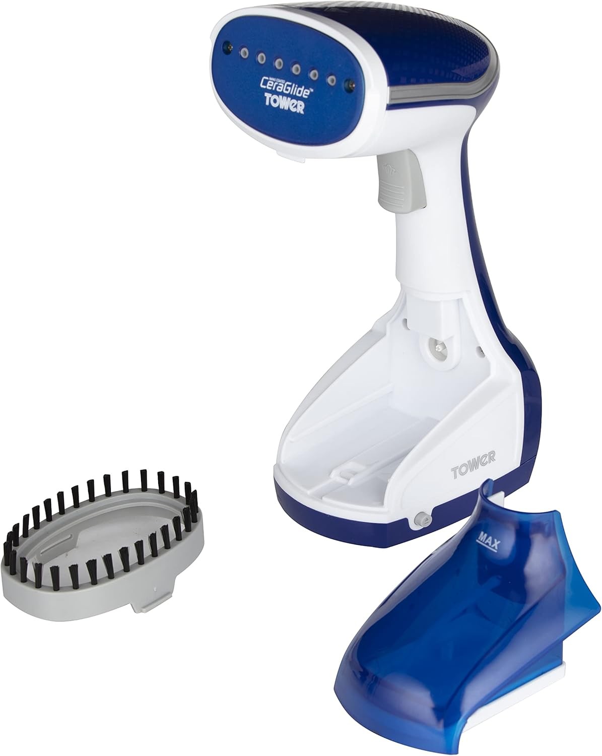 Tower Ceraglide T22014BLU Portable/Travel Garment Steamer with Ceramic Soleplate, Measuring Jug, Brush Attachment, 1000W, Blue and White