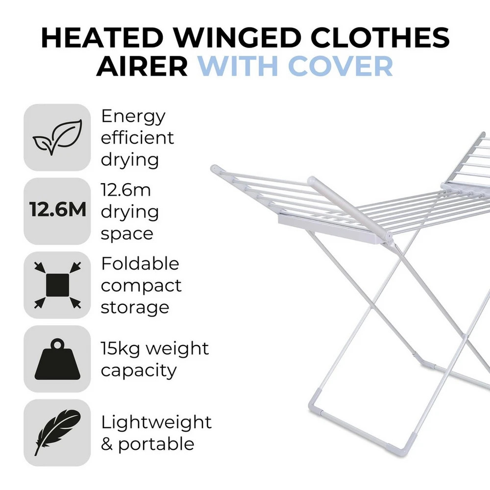 Tower Heated Winged Clothes Airer with Thermal Cover, Low-Energy Dryer, 12.6m Drying Space, Foldable, Compact Design, 15kg Capacity, 230W, Silver