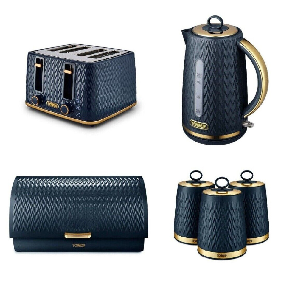 Tower Empire Midnight Blue Kitchen Set: 1.7L Kettle, 4-Slice Toaster, 3 Canisters & Bread Bin â Retro Art Deco Style
