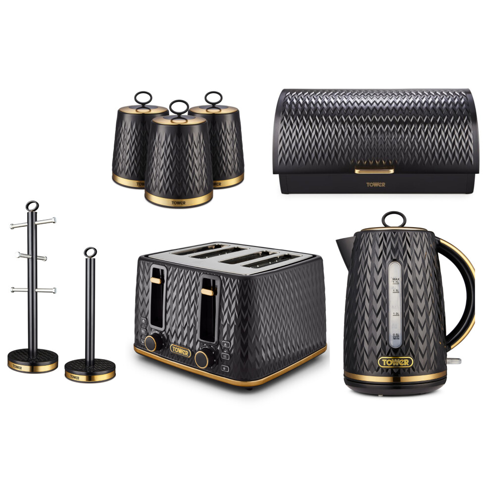 Tower Empire 1.7L 3KW Jug Kettle, 4 Slice 1600W Toaster, Bread Bin, Set of 3 Tea, Coffee & Sugar Canisters, Mug Tree & Towel Pole. Kitchen Set of 8 in Black with Brass Accents