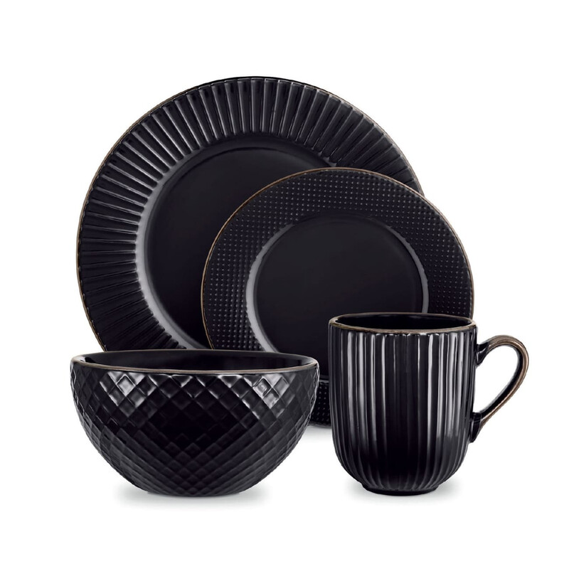 Tower Empire Dinnerware Set, 16 Piece, Stoneware, Black & Brass T867002BLK