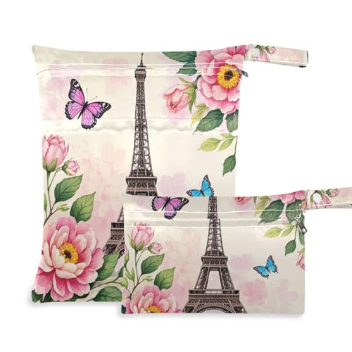 Amooorous Romantic Parisian Iron Tower with Flowers Pink washable wet swimsuit bag 2 Pack travel essentials for babies with handles for travel, yoga