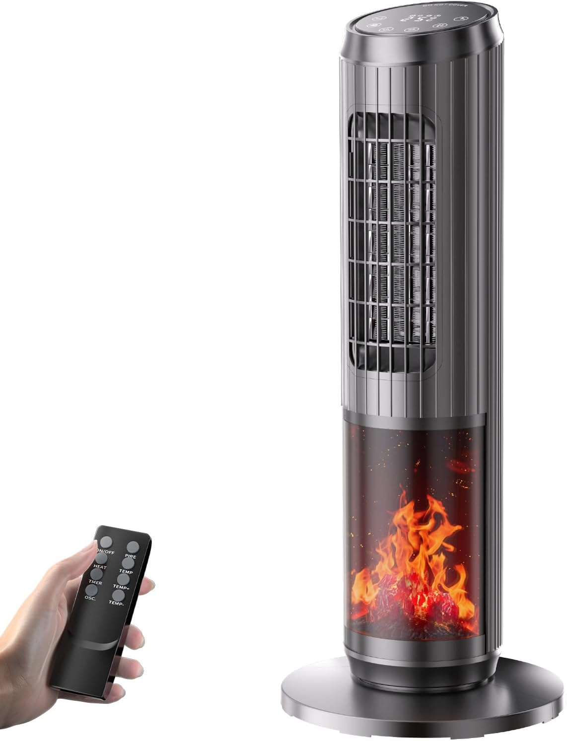 (1000/2000W, Black) 33â Oscillating Tower Fan Heater with Fireplace - Portable with LCD Display, Remote Control, Overheat Protection and Safety Flip